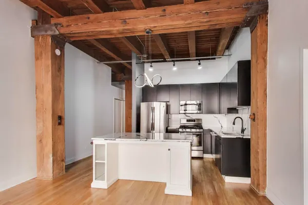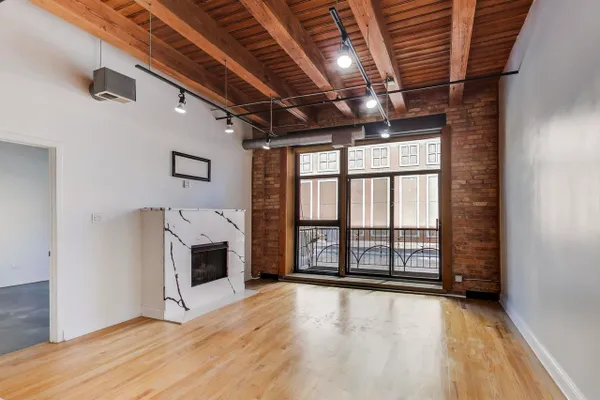 HOT SOUTH LOOP - Cosmopolitan Lofts!! Available for immediate move-in. Absolutely STUNNING, designer 1-bedroom, 1-bath + powder room, with a balcony and optional heated garage parking with private EV charger available for purchase in a boutique ELEVATOR building. This beautiful brick and timber loft is sun filled with almost floor to ceiling windows, tall-beamed ceilings, timber columns, exposed brick and hardwood floors (except bedrooms). The contemporary floor plan includes an open kitchen, living, and dining areas. New kitchen in 2026 includes 42" custom cabinetry, quartz countertop and backsplash and a large custom island with seating, and all new stainless-steel appliances. The fully enclosed bedroom has tall ceilings, a large walk-in closet and a beautiful, highly upgraded SPA BATHROOM with an oversized shower with bench, custom shower door, and double bowl sinks with designer anti fog, lighted mirrors. Large sliding door to balcony for grilling and viewing the city. Central heat and air conditioning. Separate laundry room with side-by-side washer/dryer in unit! Gas fireplace with quartz surround. Large storage cage included. The building has a large gym/fitness room off the lobby. Located in the heart of the South Loop restaurant and shopping district, next door to Trader Joe's and close to Jewel Osco, FFC Gym, Columbia College, and the lakefront. Easy access to CTA train or bus. Heated garage parking space #34 with EV charger is available in the building garage $30,000 plus monthly garage assessment of $70.36/month. This is a fabulous, MUST-SEE HOME!!